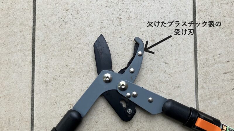硬い枝を何度も切るうちに負荷がかかり、さらに経年劣化も重なって、ついにプラスチックが耐えきれずに欠けてしまったようです。