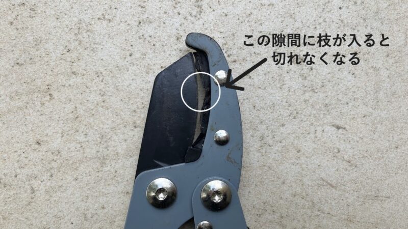 欠けた部分に枝が入ると刃がうまくかみ合わず、特に細い枝が切れなくなったり、太い枝も最後の5mmくらい切り残したり、スパッと切れなくなってしまいました。