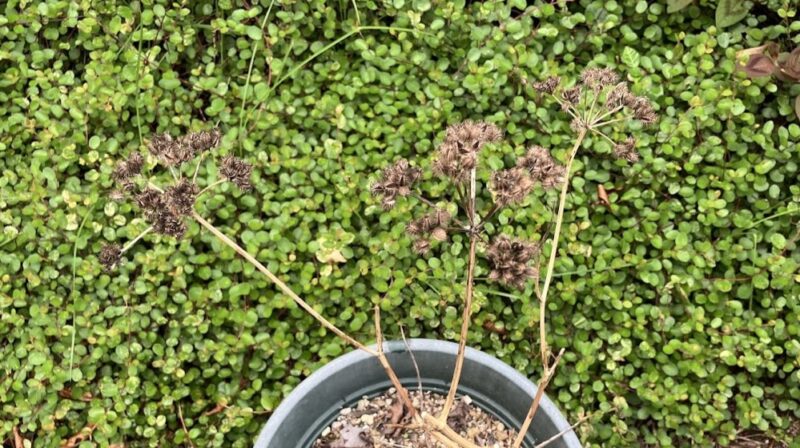 茶色く枯れた花茎ごと、ハサミでカットします。オルラヤの種はトゲトゲしていて素手で触ると少しチクチクするので、手袋をすると安心です。