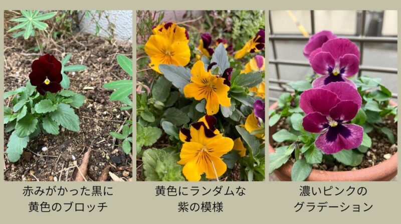 ビオラやパンジーの原種(野生の姿)は、道端のスミレのように紫色や黄色をしていることが多いそうです。